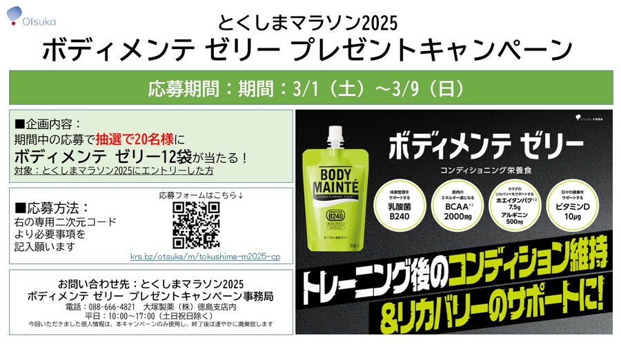 とくしまマラソン2025にエントリーされた方を対象に、大塚製薬株式会社が実施する「ボディメンテゼリー」のプレゼントキャンペーンについて、お知らせいたします。