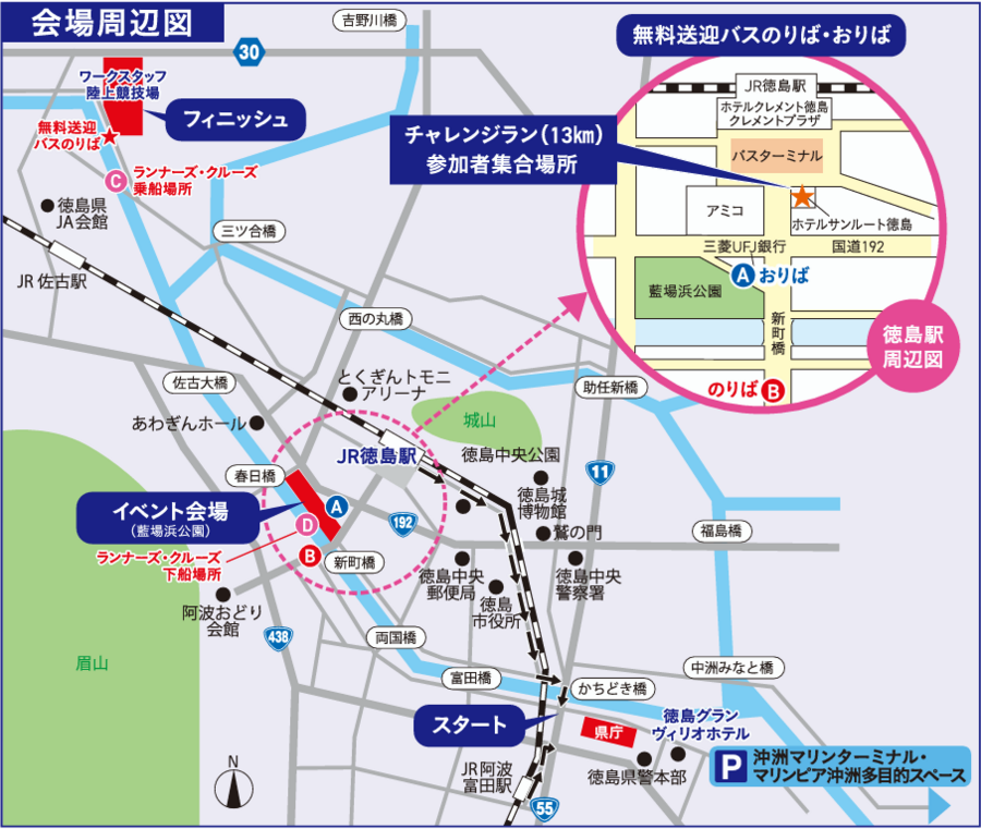 チャレンジラン13㎞レースの集合場所は、徳島駅付近にございますホテルサンルート徳島西側となっております。